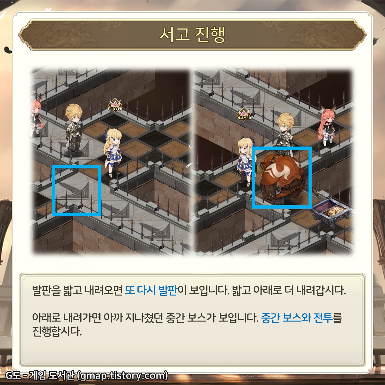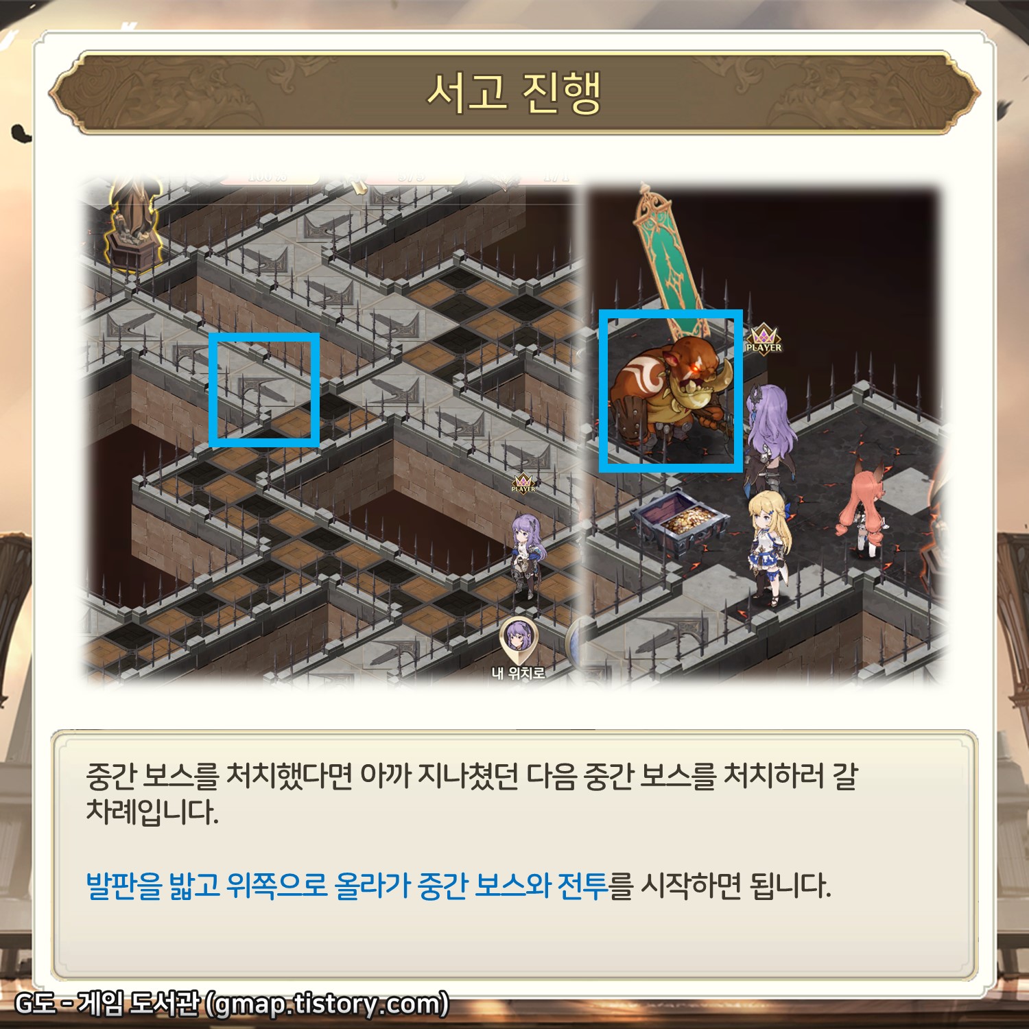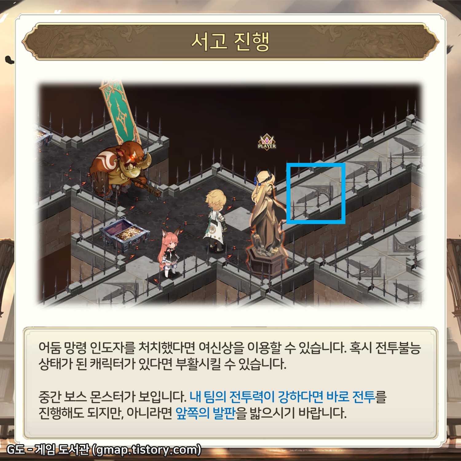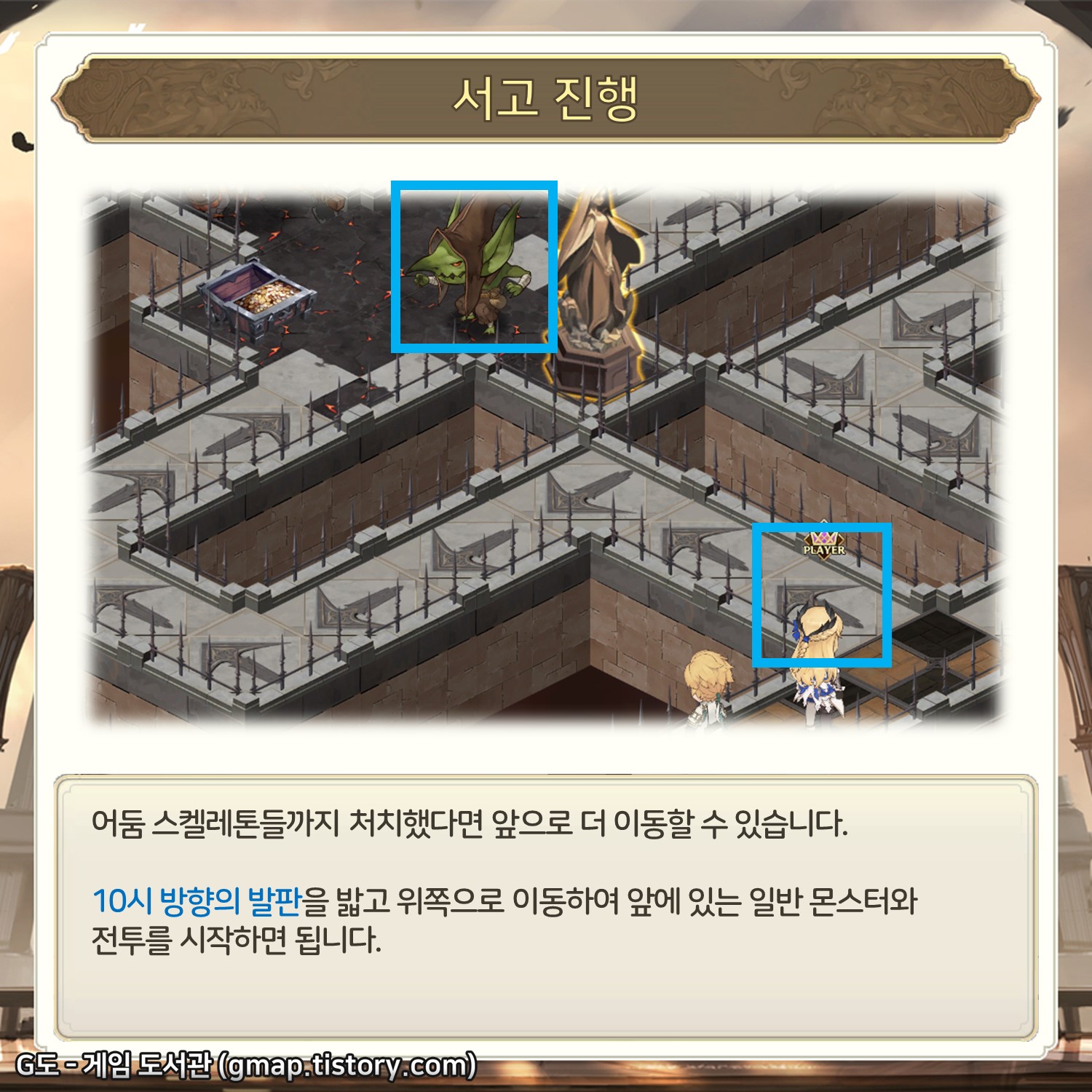 중간 보스 몬스터가 보입니다. 내 팀의 전투력이 14 서고를 진행하기에는 너무 강력하다면 바로 전투를 진행해도 되지만, 아니라면 좀 더 안전하게 가는 것이 좋습니다. 2시 방향의 발판을 밟읍시다.