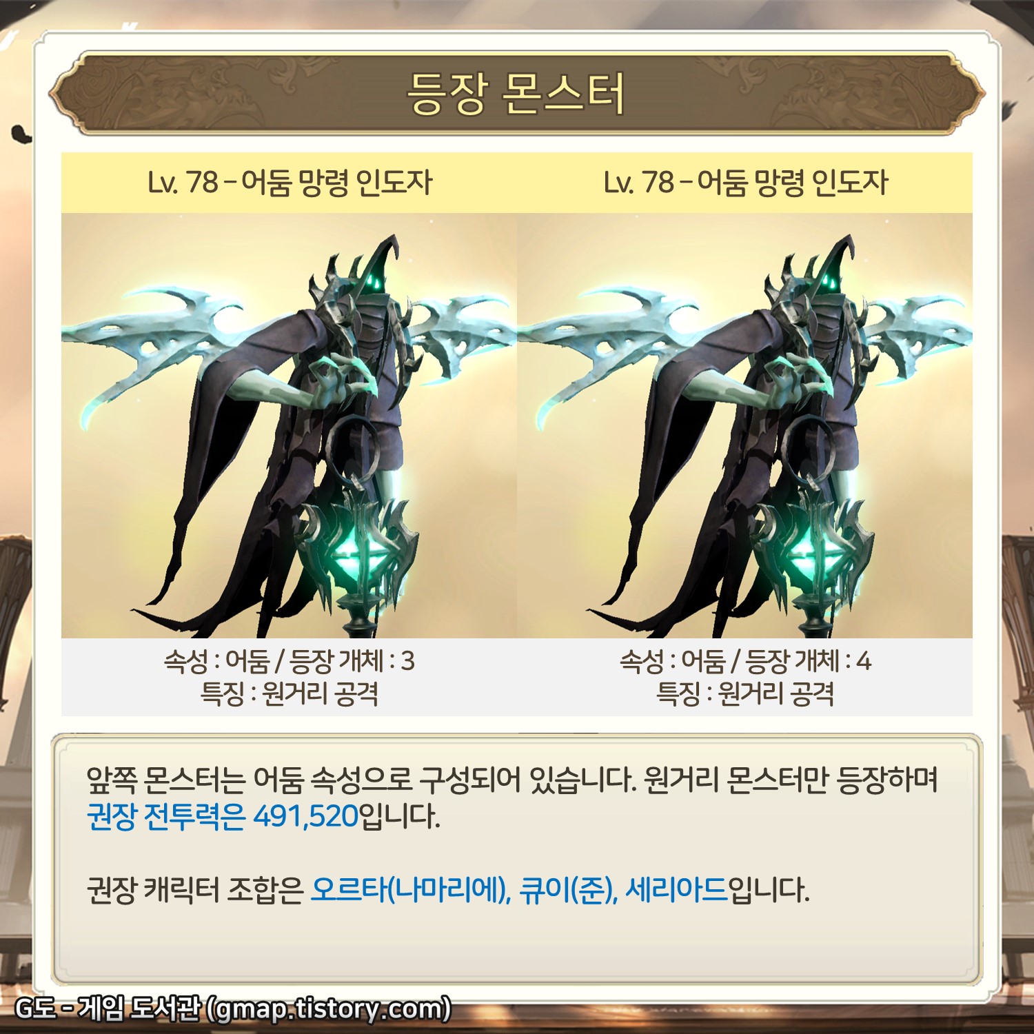 앞쪽 몬스터는 어둠 속성으로 구성되어 있습니다. 원거리 몬스터만 등장하며 권장 전투력은 491,520입니다.