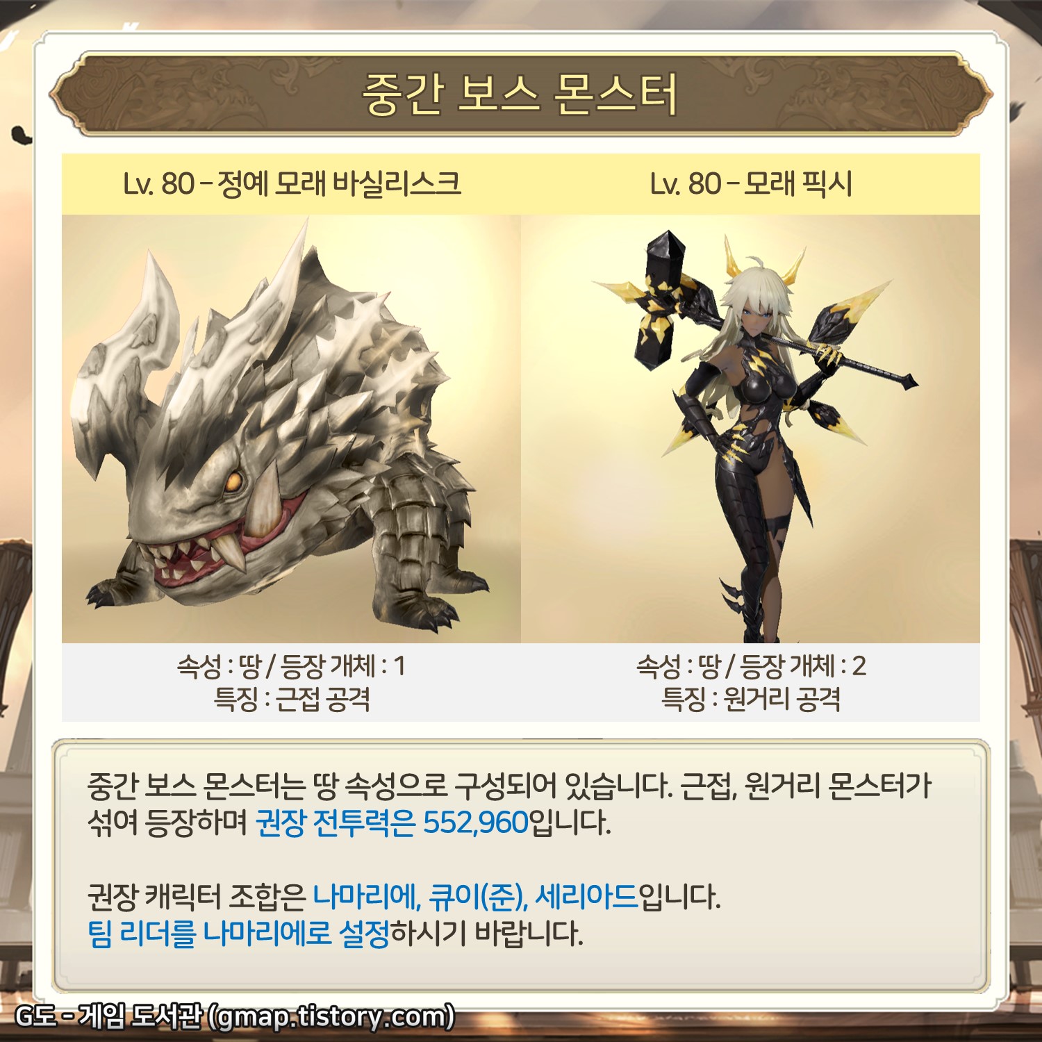 중간 보스 몬스터는 땅 속성으로 구성되어 있습니다. 근접, 원거리 몬스터가 섞여 등장하며 권장 전투력은 552,960입니다.