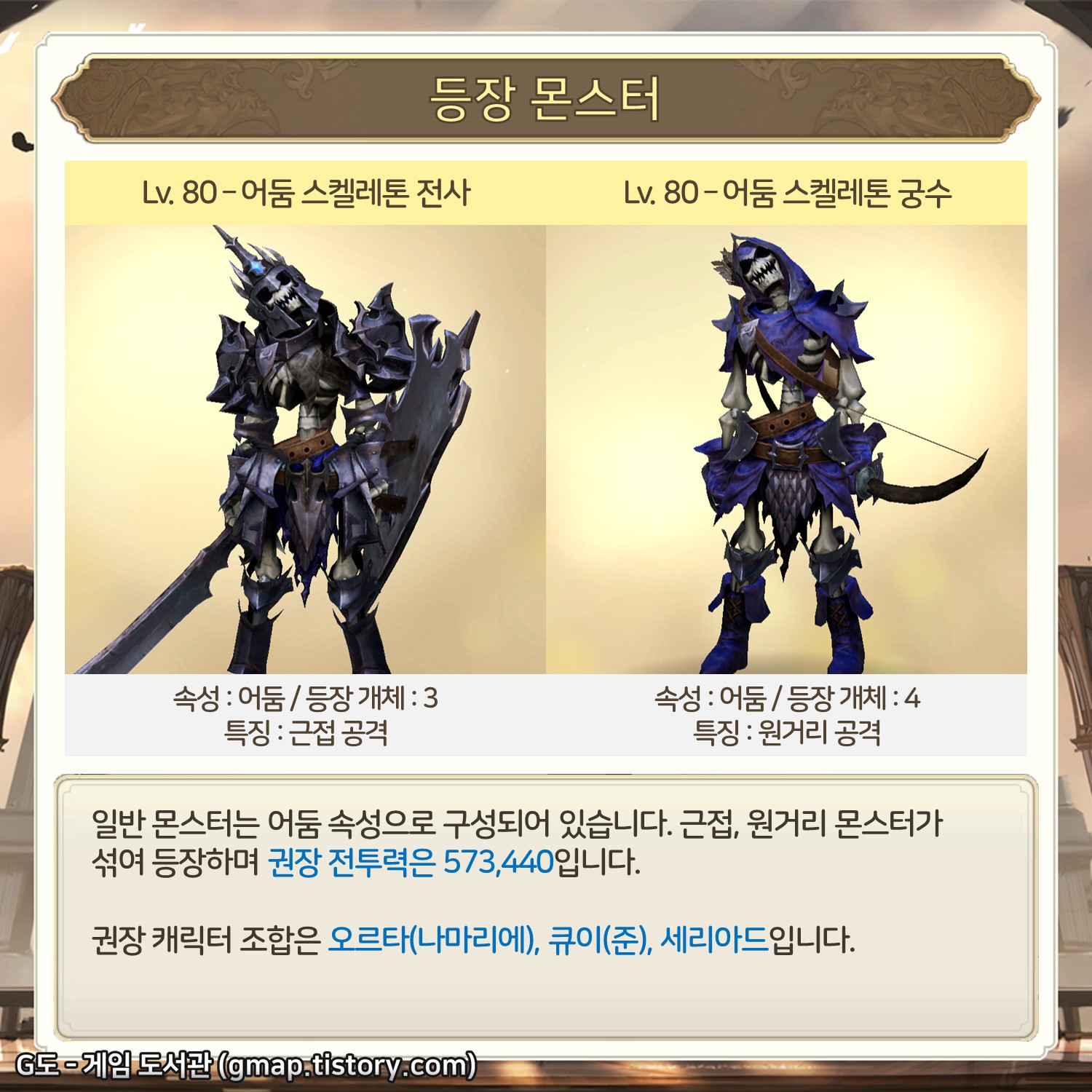 일반 몬스터는 어둠 속성으로 구성되어 있습니다. 근접, 원거리 몬스터가 섞여 등장하며 권장 전투력은 573,440입니다.
