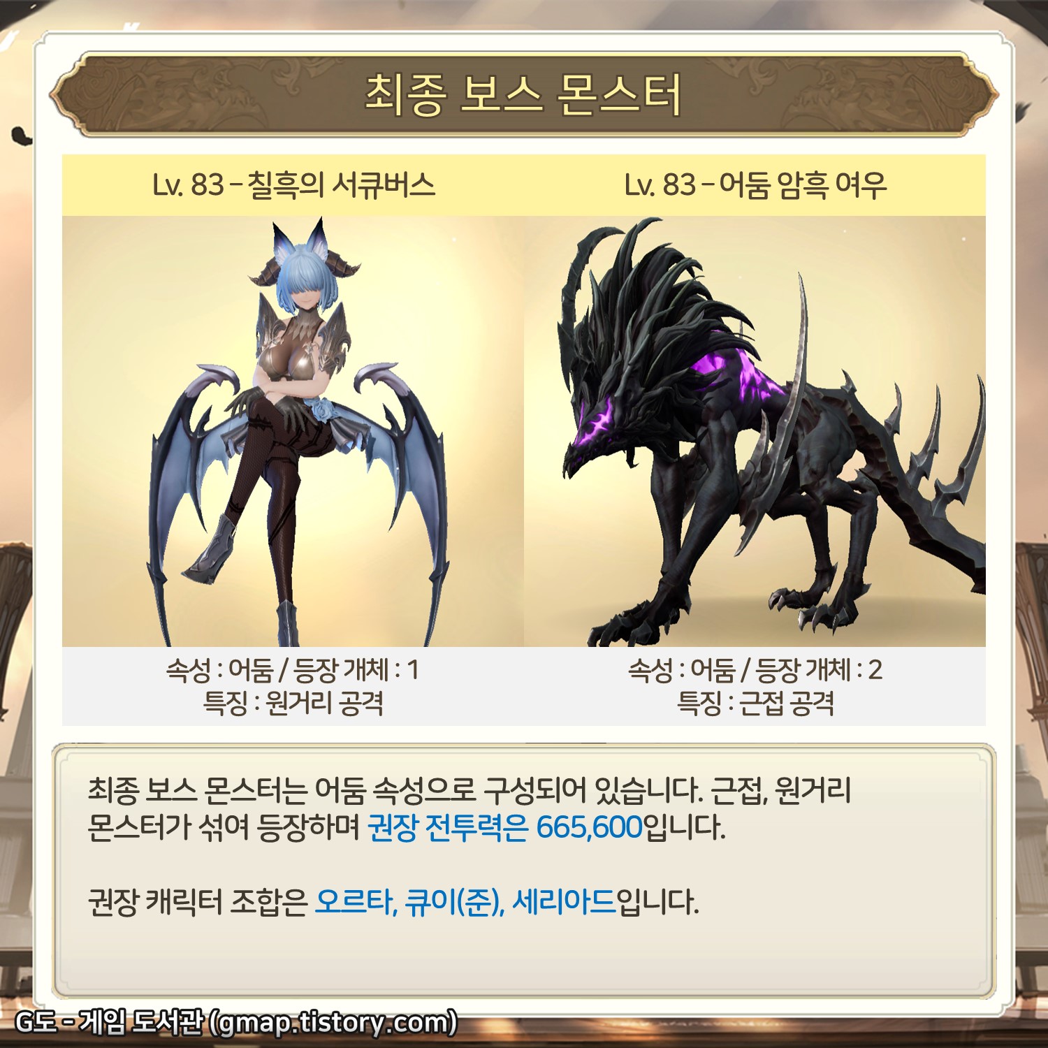 최종 보스 몬스터는 어둠 속성으로 구성되어 있습니다. 근접, 원거리 몬스터가 섞여 등장하며 권장 전투력은 665,600입니다.
