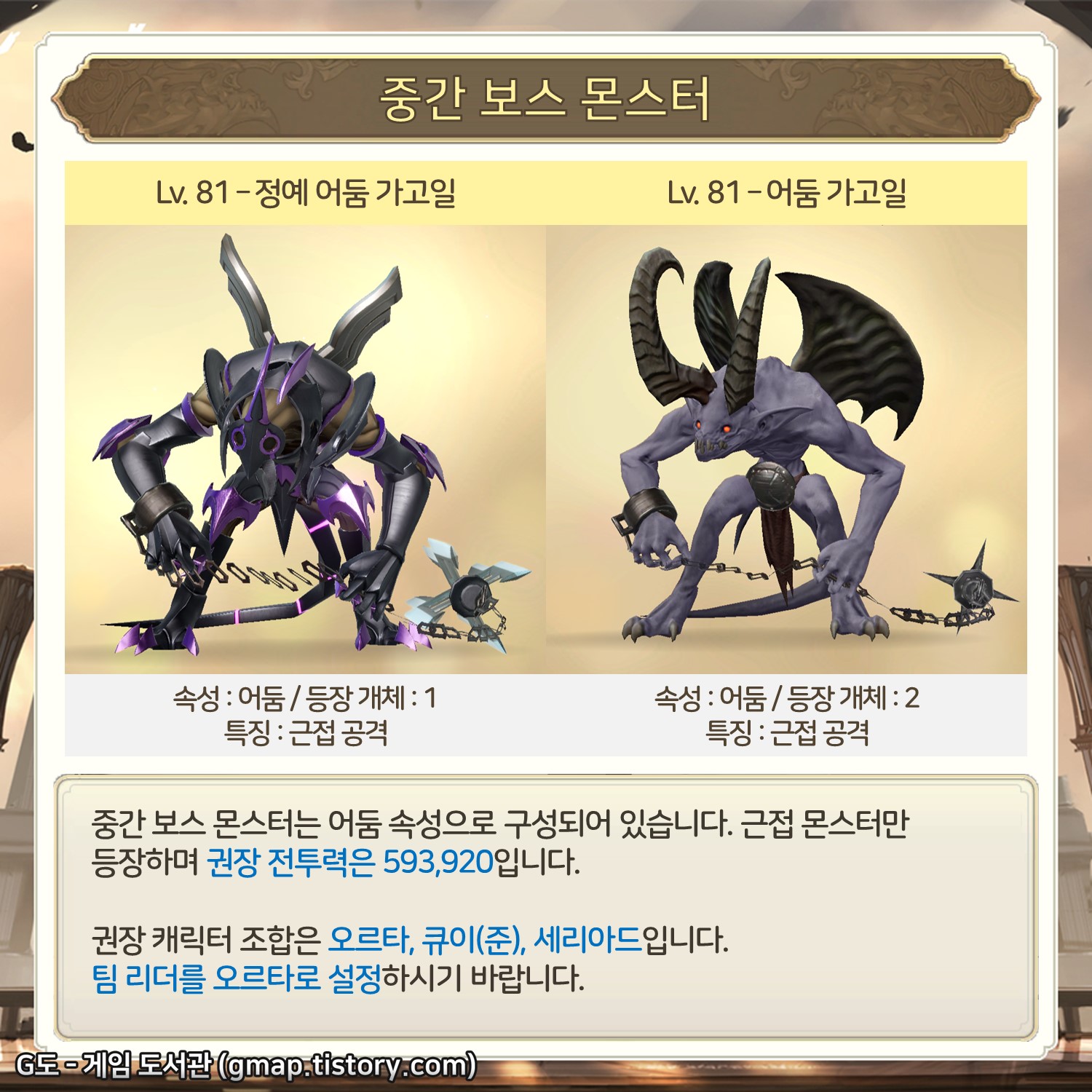 중간 보스 몬스터는 어둠 속성으로 구성되어 있습니다. 근접 몬스터만 등장하며 권장 전투력은 593,920입니다.